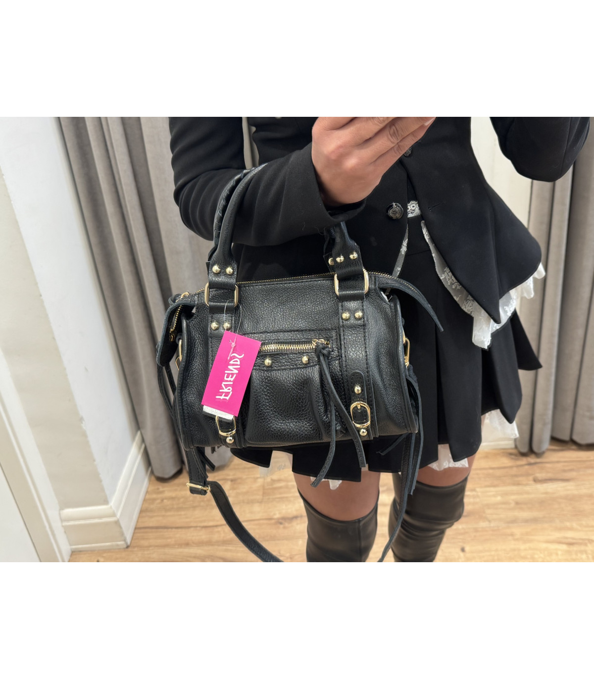 Este bolso negro de cuero combina a la perfección con estilismos urbanos, looks rock chic o conjuntos más clásicos, convirtiéndose en un básico atemporal que nunca pasa de moda.