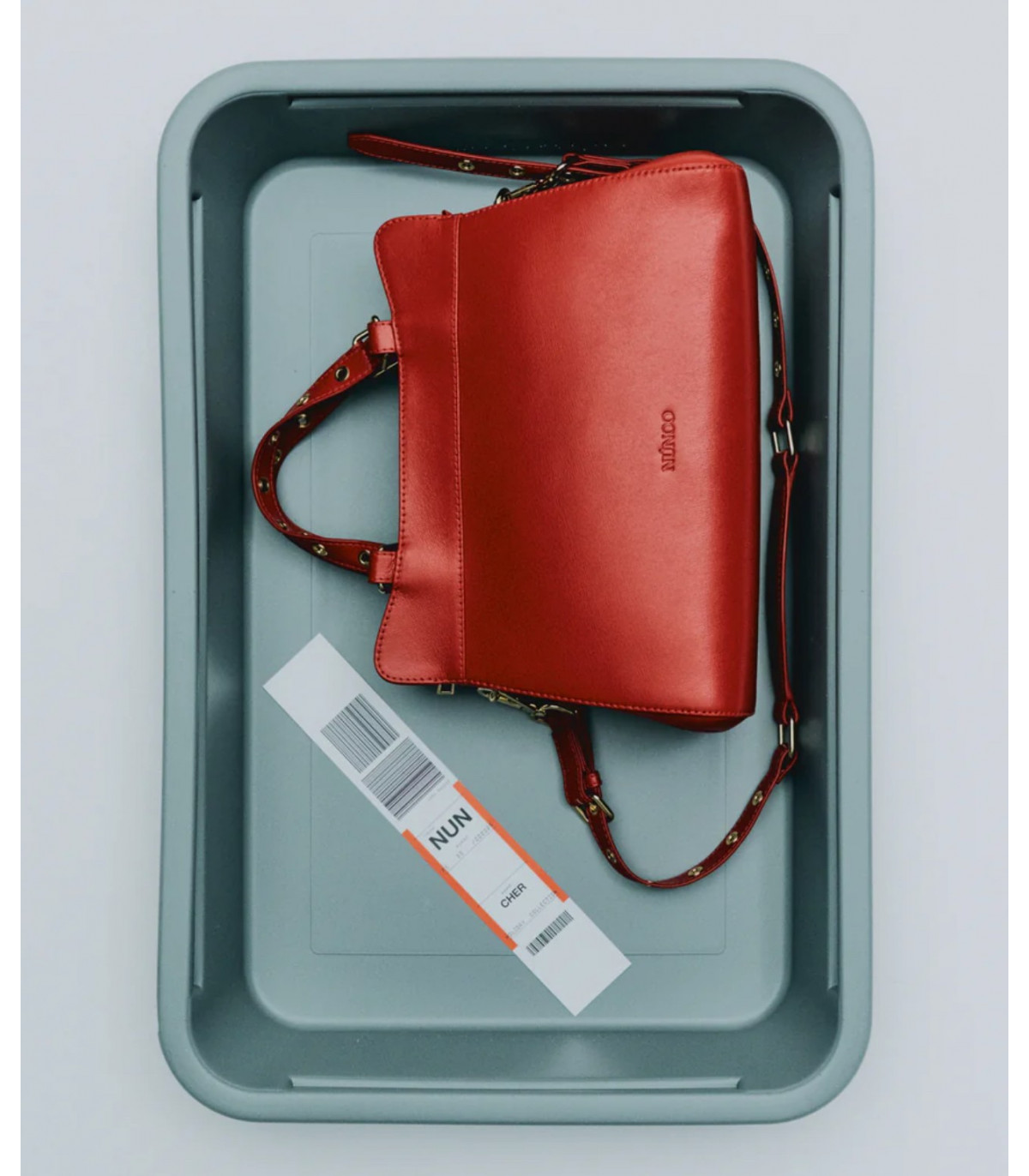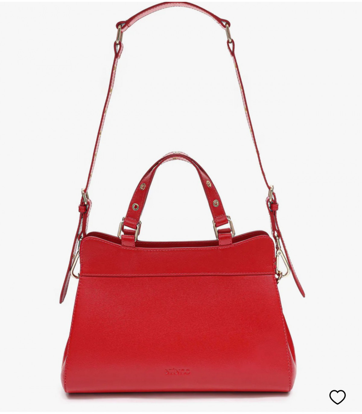 Cher en rojo brillante de Florencia con detalles dorados tiene un gran compartimento con asas y viene con una correa para el hombro.