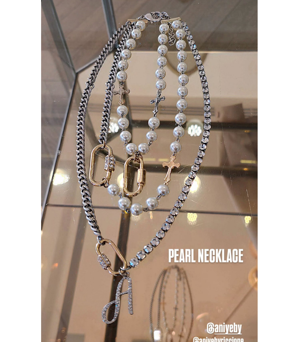 Este collar de Aniye By, que logra el equilibrio perfecto entre lo romántico y lo atrevido, combina perlas encantadoras, brillantes diamantes de imitación y cadenas de metal con acabados en plata y oro. Los colgantes de cruz y los anillos geométricos completan el diseño con espíritu gótico.
