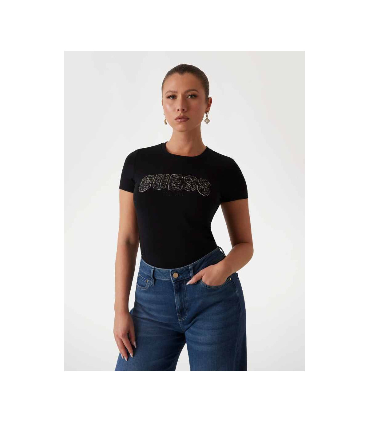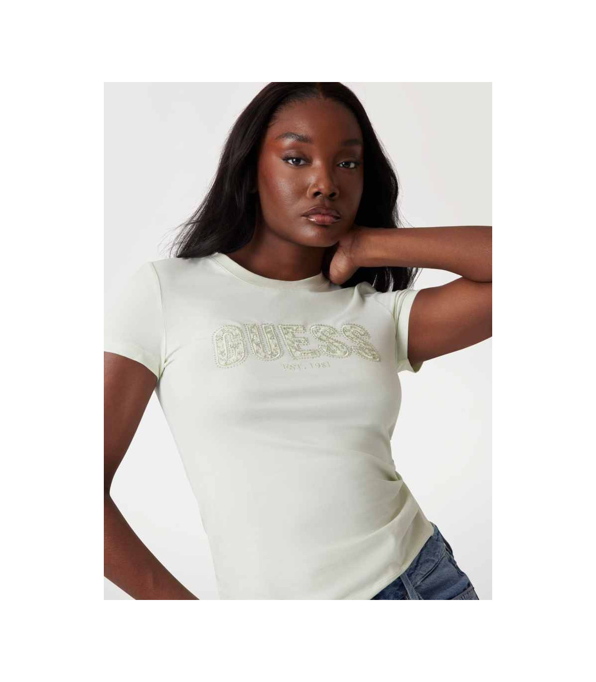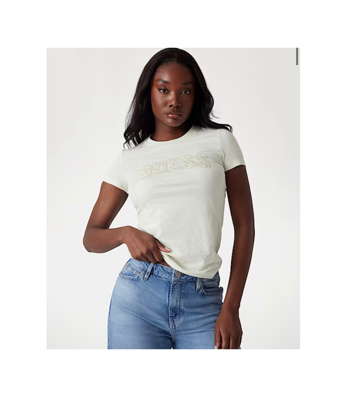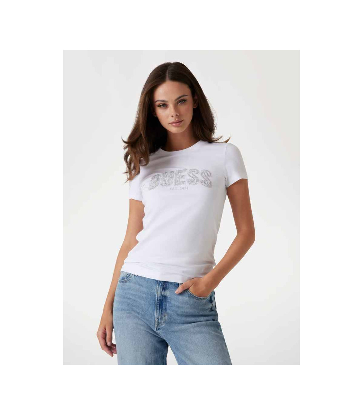 Camiseta Guess de mujer en blanco, corte slim y logo frontal. Un básico cómodo y con estilo para tu día a día. ¡Disponible en FriendsnShop!
