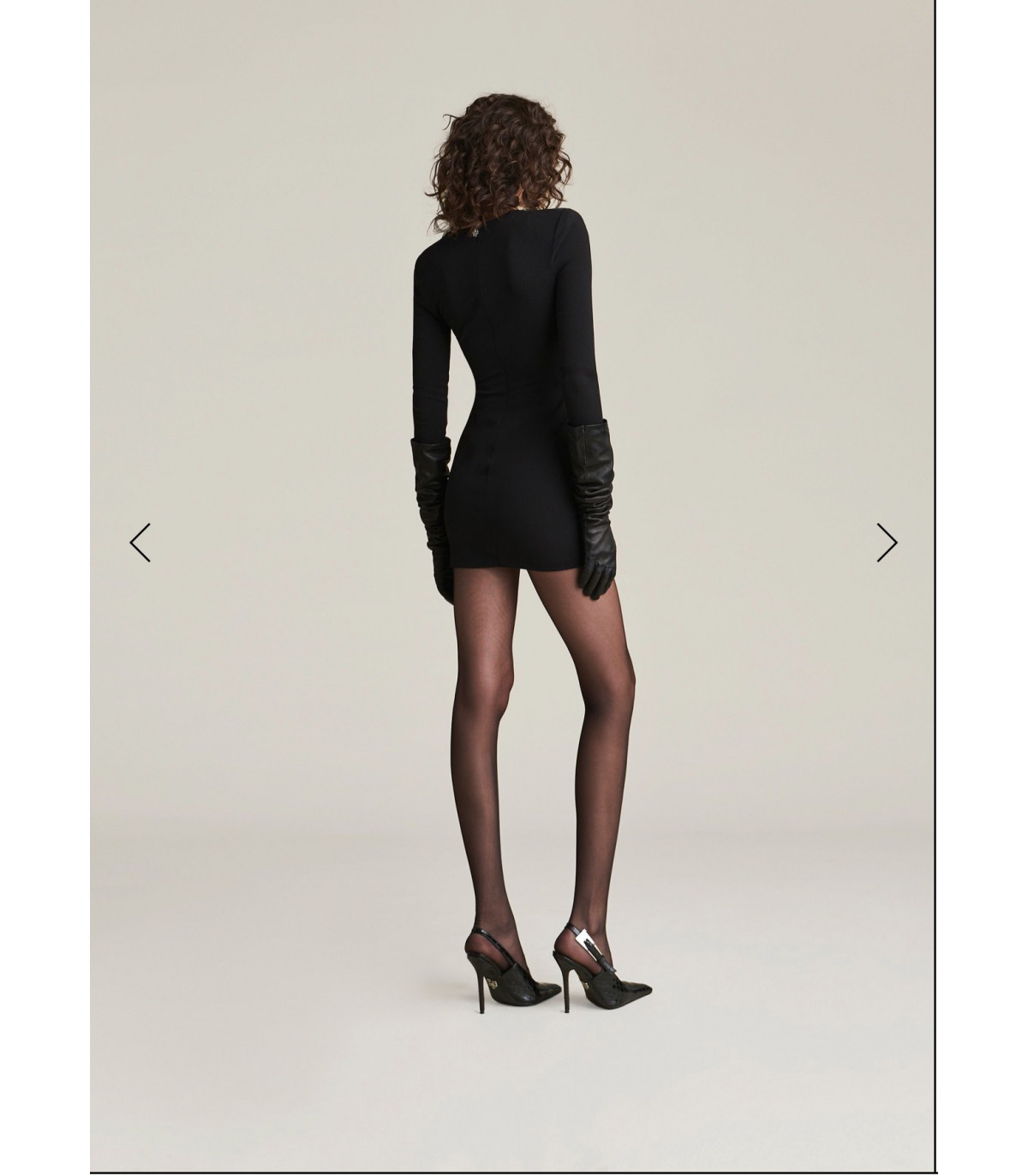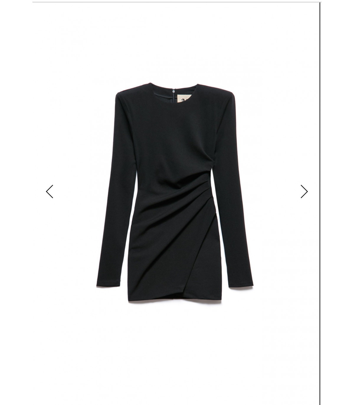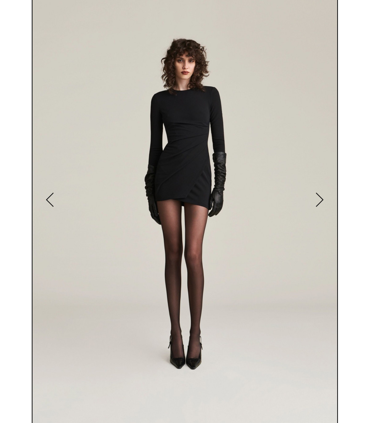 Su corte ajustado y asimétrico, junto con un fruncido estratégico, esculpen las curvas con precisión. Las mangas largas aportan equilibrio y sofisticación frente al escote minimalista, mientras que la falda cruzada añade un toque dramático dejando al descubierto las piernas con mucho estilo.