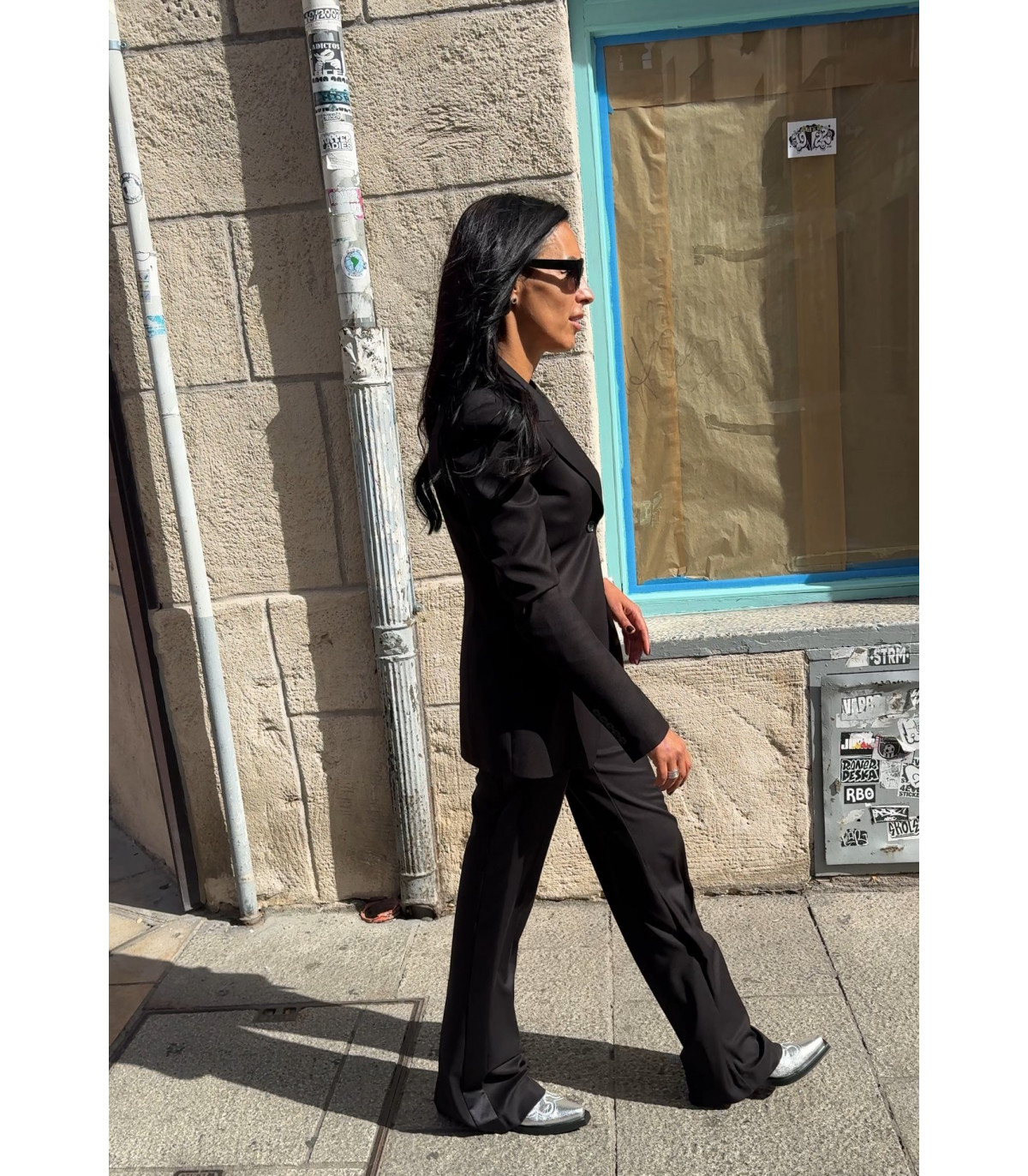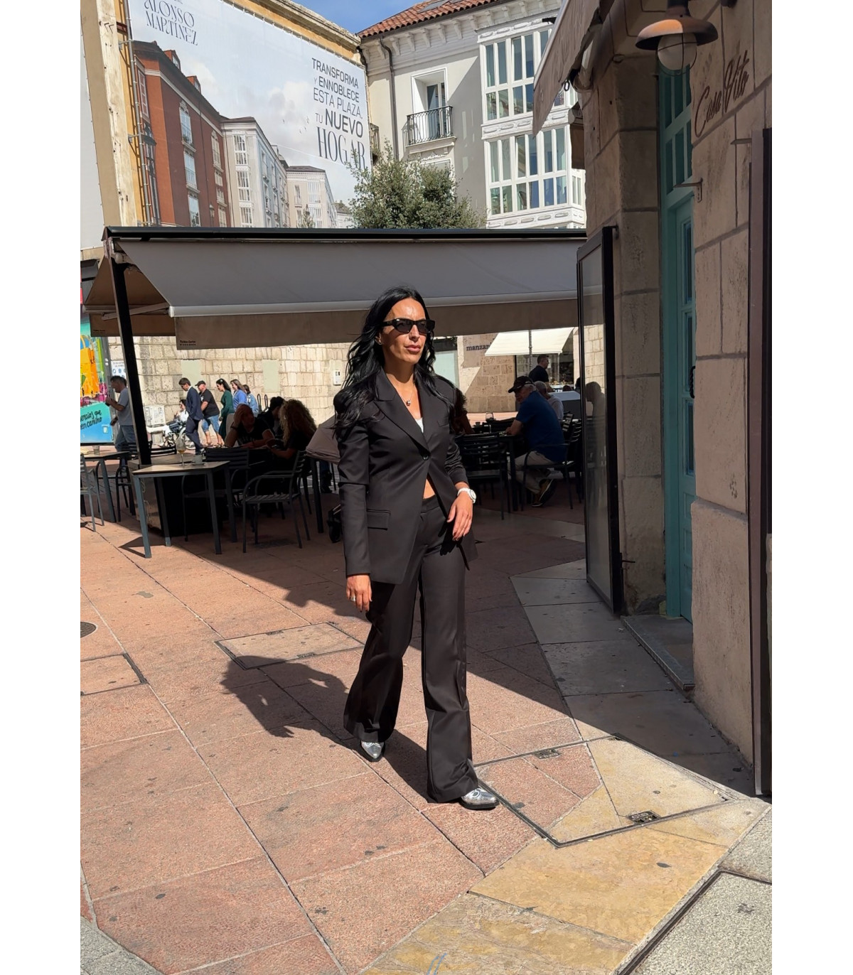 Los pantalones Dandy presentan pernera acampanada, pliegue planchado y rayas laterales, combinando sastrería tradicional y estilo moderno. Perfectos con el blazer a juego.