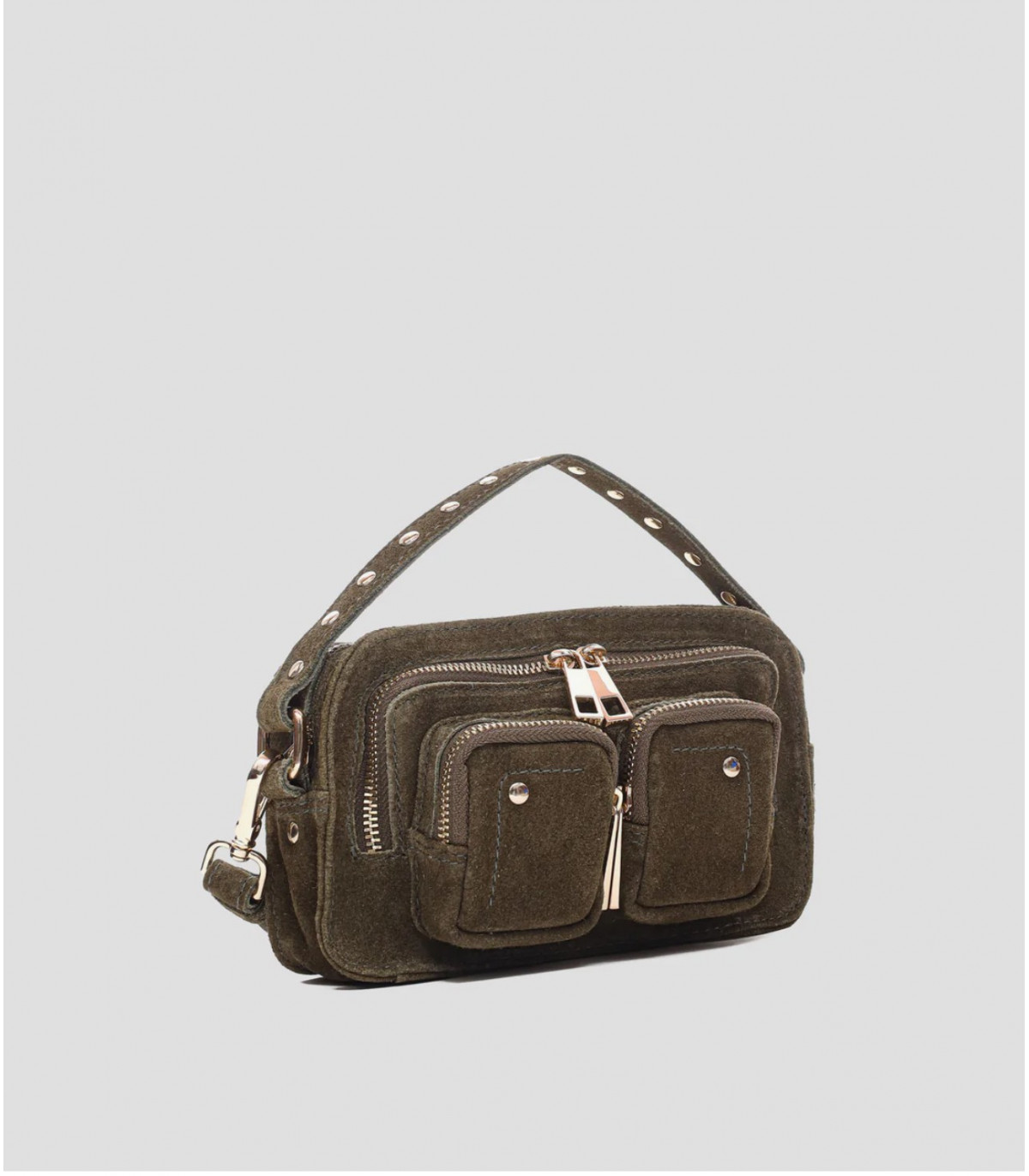 Helena Suede Dark Olive, bolso de ante verde oliva con detalles dorados. Versátil, elegante y con cadena y correa ajustable. Disponible en FriendsnShop.