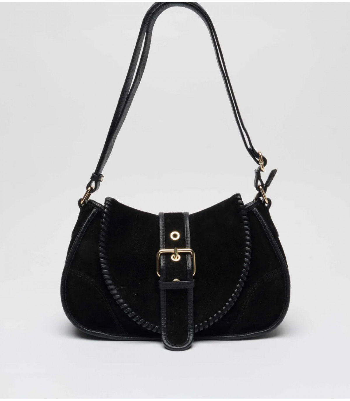 Maria Stitch Suede Black Gold, bolso de ante negro con remates en piel. Sofisticado, versátil y exclusivo. Disponible en FriendsnShop.
