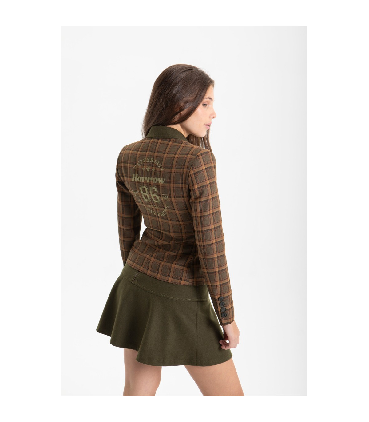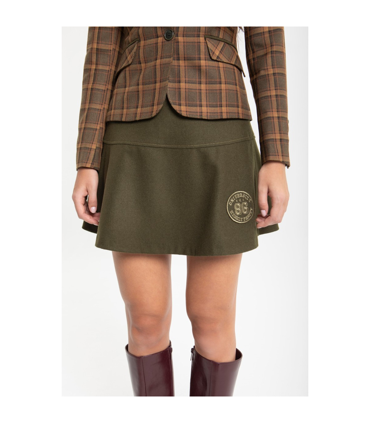 Falda de lana verde con escudo Highly Preppy. Elegancia, comodidad y estilo preppy en una prenda versátil ideal para otoño e invierno.