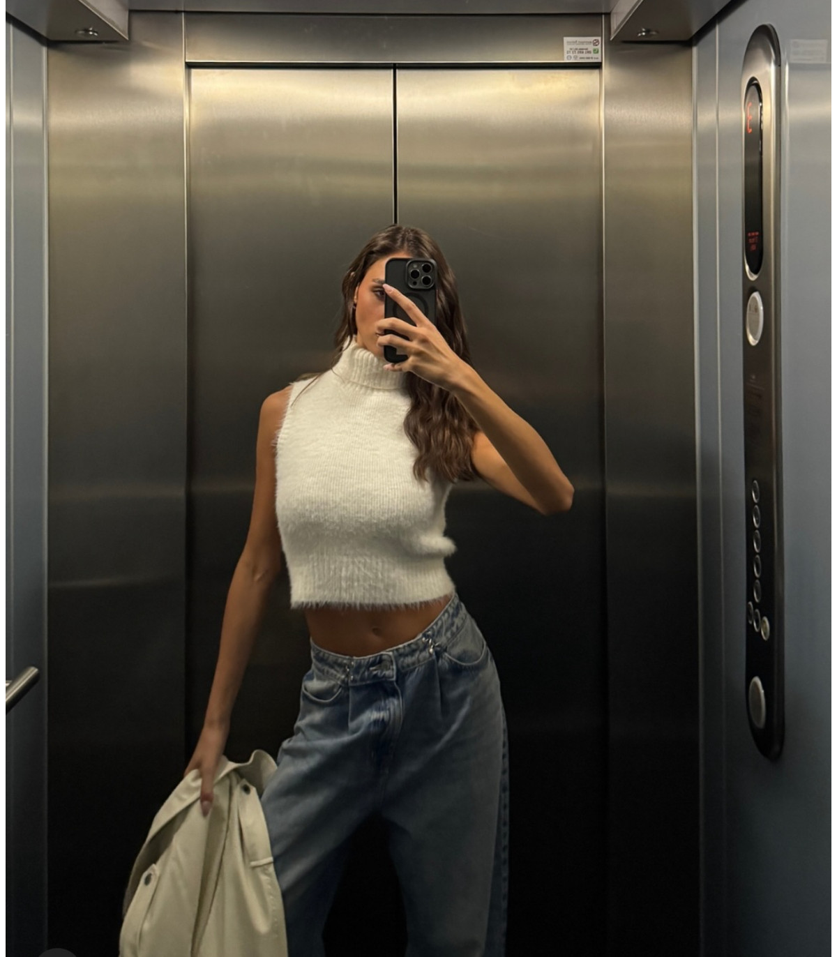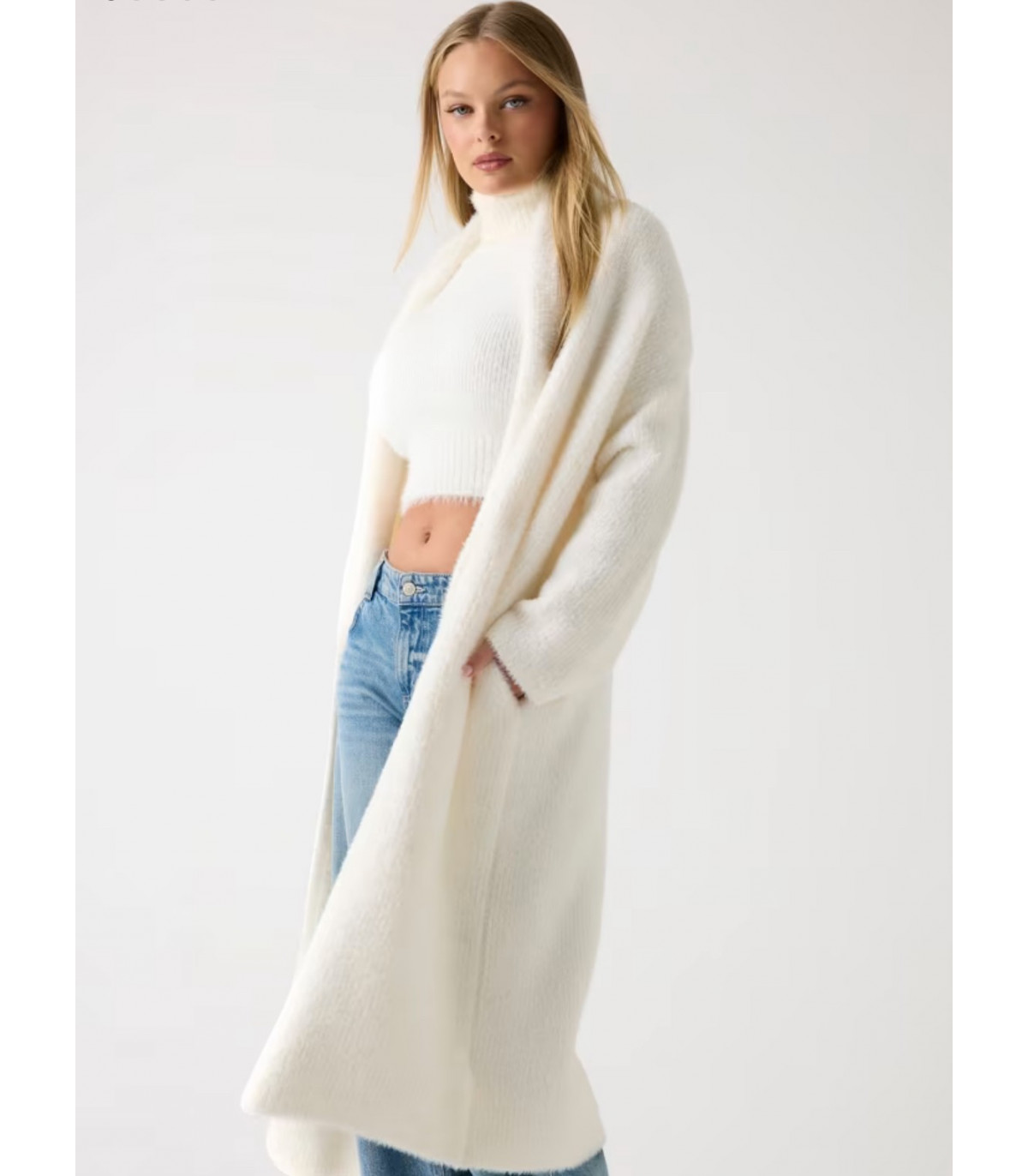 Chaleco Guess blanco de hilado peludo con corte relajado. Suave, moderno y versátil para looks casuales y sofisticados. Disponible en Friendshop.