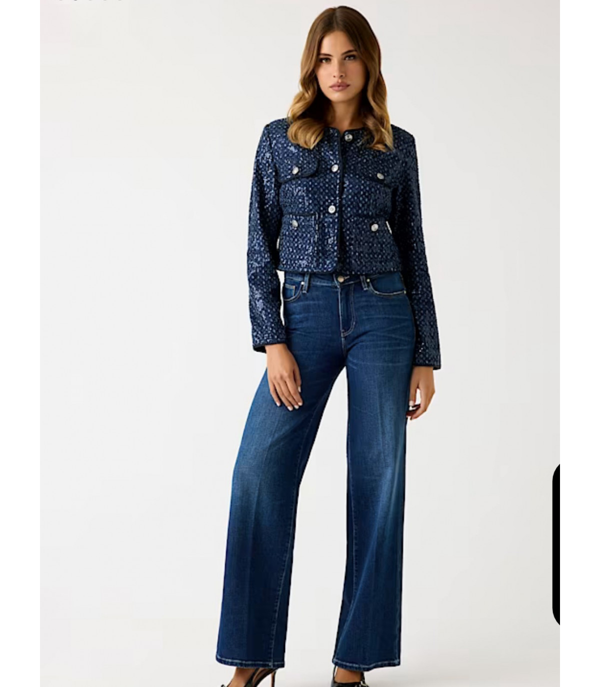 La chaqueta vaquera con lentejuelas es la prenda imprescindible para dar un giro sofisticado a tus looks casuales. Diseñada en denim azul de alta calidad, esta chaqueta combina la resistencia del tejido vaquero con el brillo sutil de las lentejuelas, logrando un equilibrio perfecto entre comodidad y glamour.