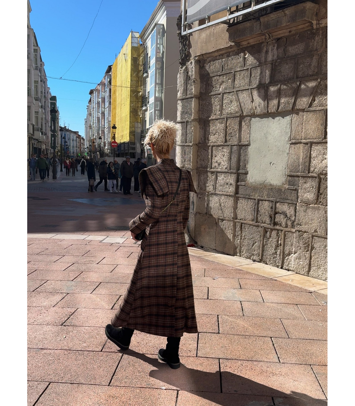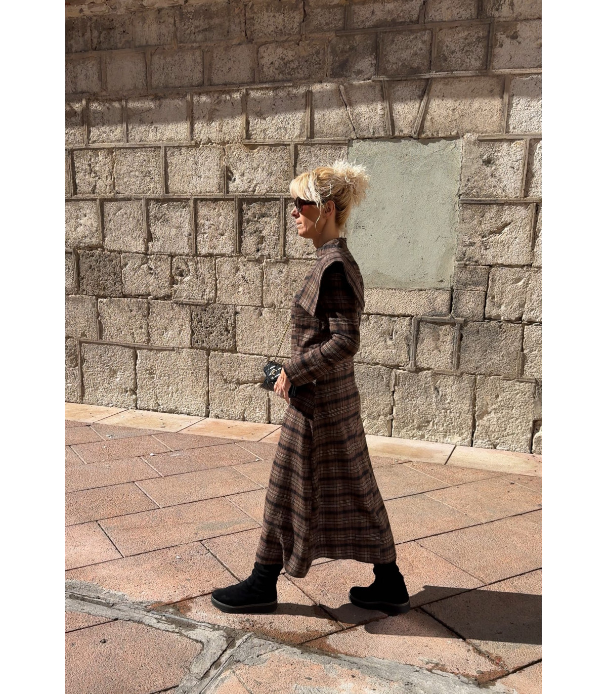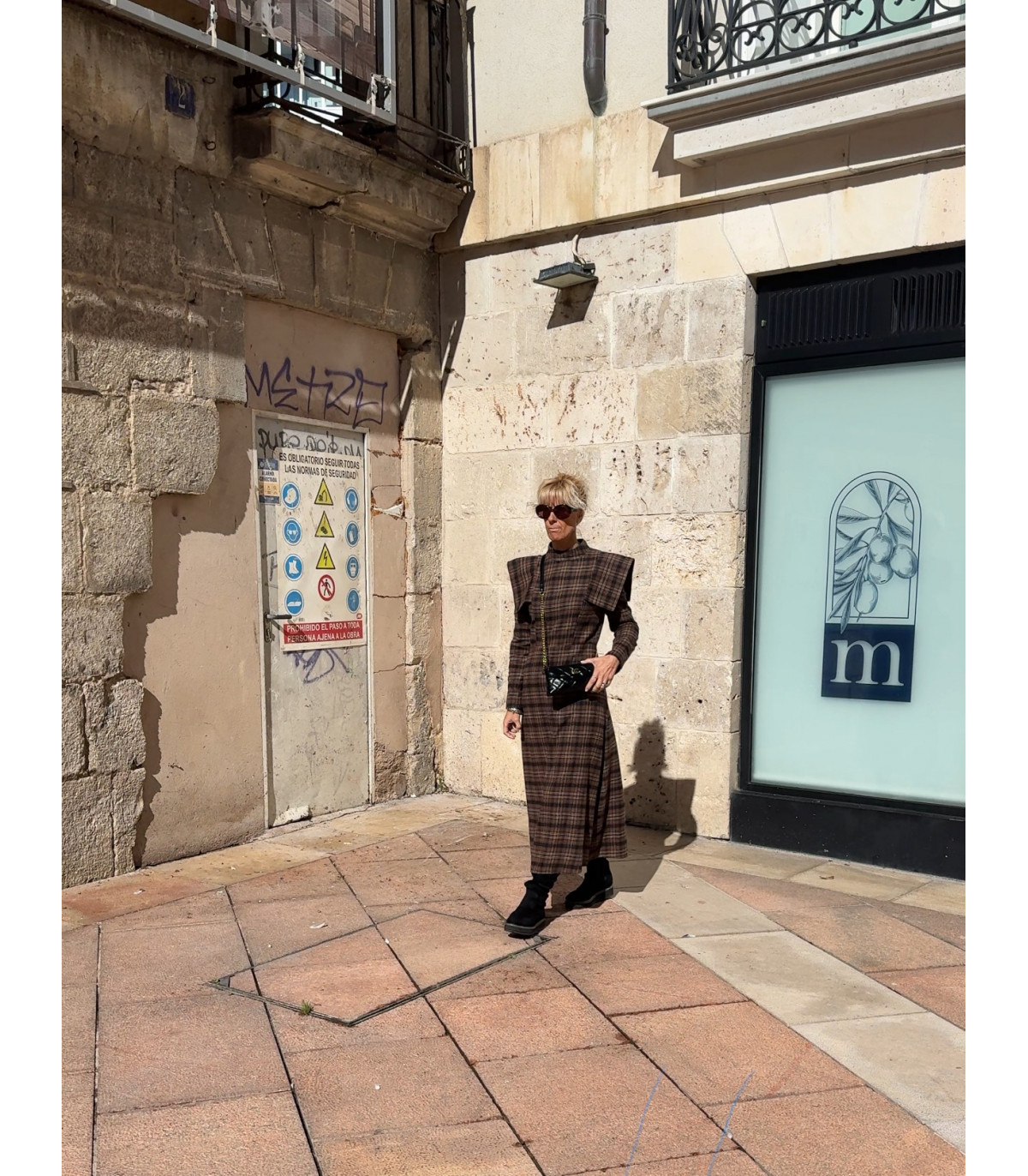 El vestido largo de cuadros es una pieza sofisticada y con carácter, perfecta para mujeres que buscan destacar con estilo. Su diseño estructurado con hombros marcados y corte midi realza la figura aportando un aire moderno y elegante, sin renunciar a la comodidad.