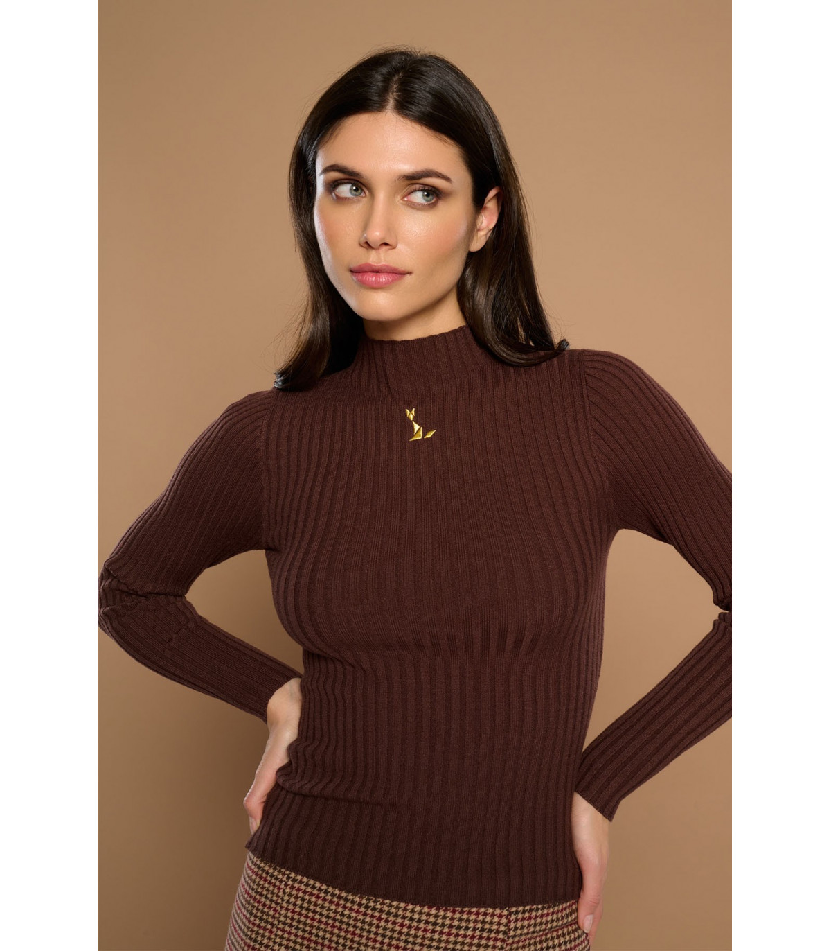 Brown Sofía Sweater de Minueto, un jersey de punto fino marrón con cuello alto y logo bordado dorado. Elegancia y comodidad en una sola prenda.
