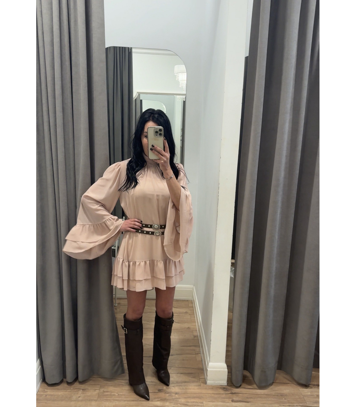 Vestido Teodora de Aniye By, diseño fluido con volantes y mangas amplias. Un vestido femenino y sofisticado perfecto para ocasiones especiales. Disponible en FriendsnShop.