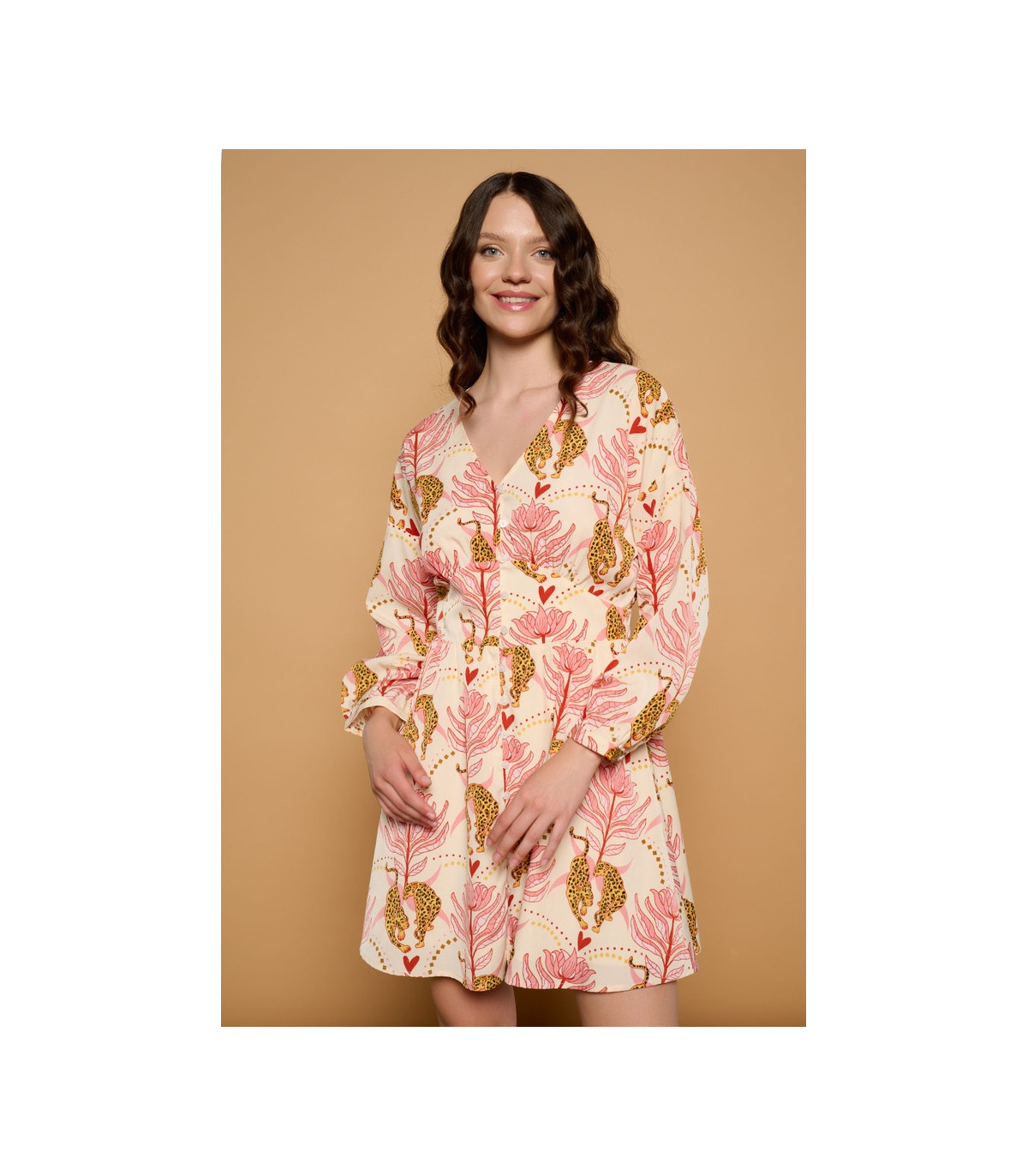 Descubre el Agusta Dress de Minueto en FriendsnShop. Vestido corto con estampado floral en tonos rosa y mostaza, femenino y perfecto para looks de primavera y verano.
