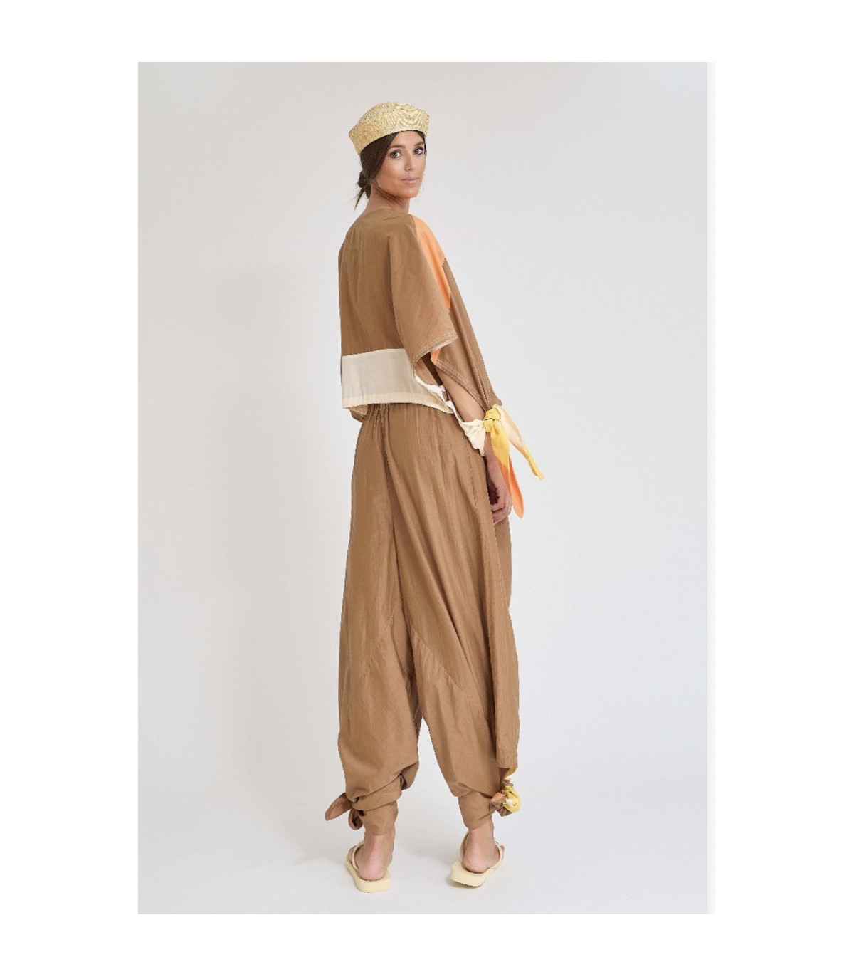 Su diseño destaca por la combinación de colores naranja, marrón y crudo, creando un contraste armónico de inspiración natural. Los puños con lazada ajustable aportan un detalle femenino y diferencial, mientras que su silueta amplia y fluida aporta comodidad sin perder estilo.
