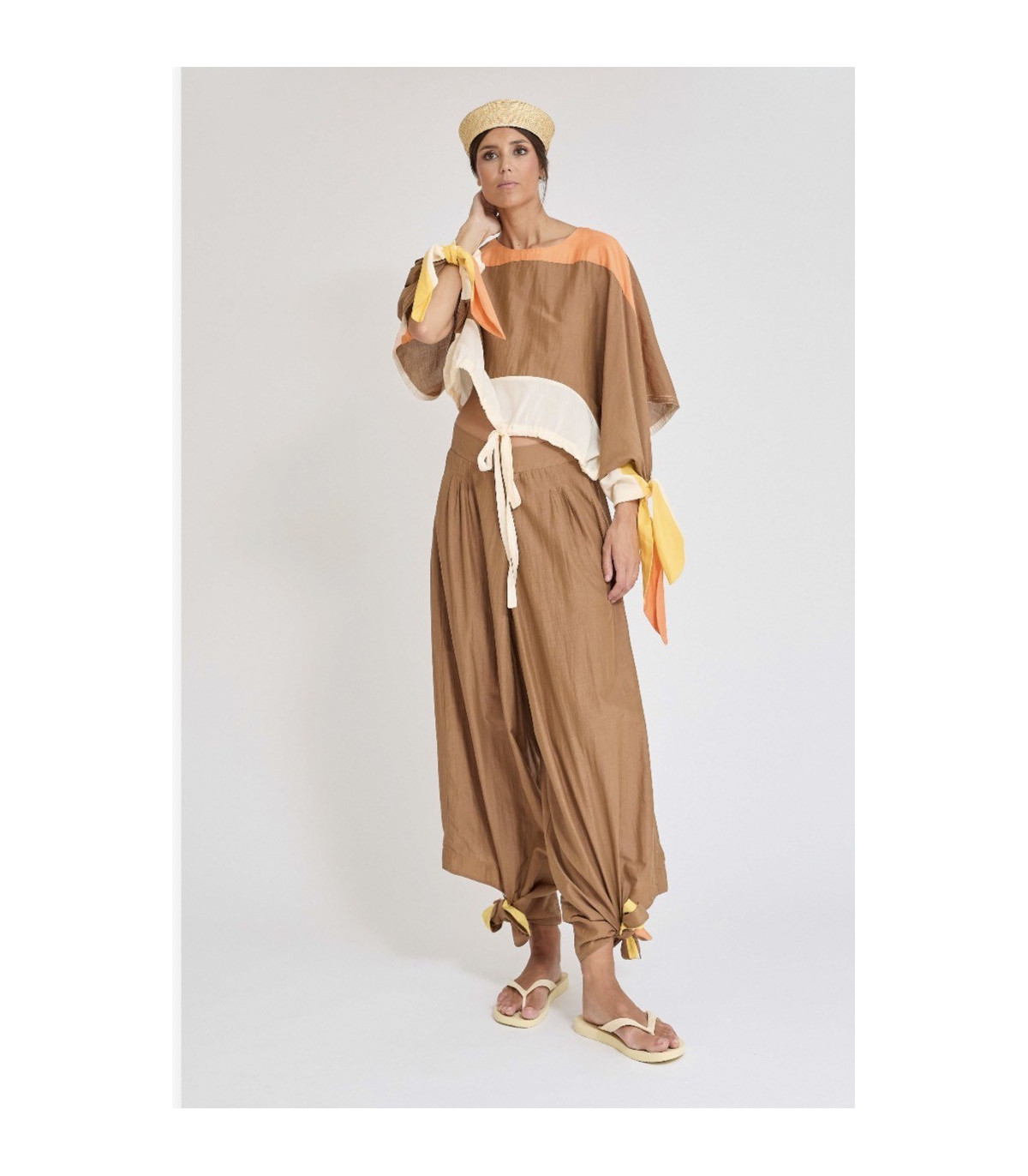 Compra el pantalón Urola de Zaitegui SS26 en FriendsnShop. Diseño baggy en seda y algodón color marrón con puños ajustables en lazo. Estilo sofisticado y cómodo.
