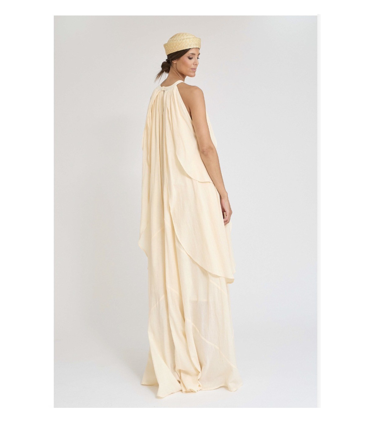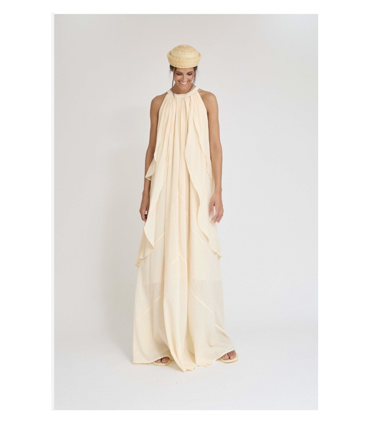 Vestido halter largo de capas en algodón 100%, elegante y fluido para verano y eventos especiales.