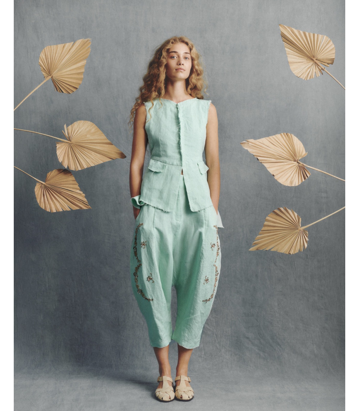 .Chaleco de lino bordado con piedras plateadas en la espalda. Elegante y exclusivo SS26.