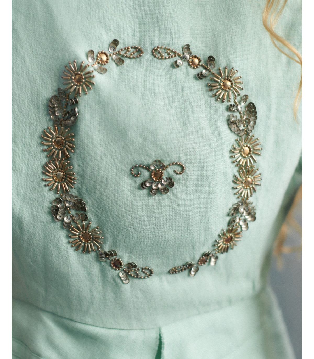 Confeccionado en lino de alta calidad, este chaleco verde para mujer destaca por su diseño estructurado y femenino. En la parte trasera incorpora un delicado bordado con piedras plateadas, aportando un toque exclusivo y luminoso que eleva cualquier estilismo.