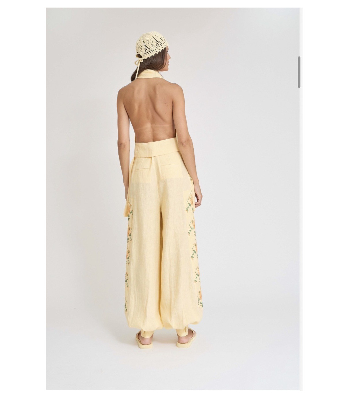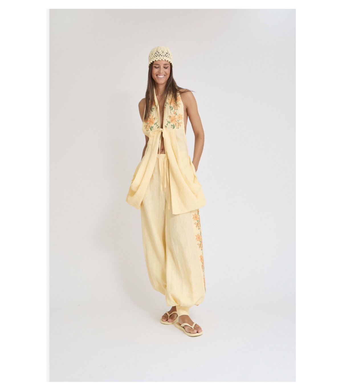 Confeccionado en lino color vainilla, este chaleco para mujer destaca por su diseño fluido y su favorecedor escote halter con lazada frontal, que estiliza la silueta y aporta un aire elegante y contemporáneo. El detalle diferencial lo encontramos en su bordado floral en el pecho, realizado con acabado delicado que refleja la esencia artesanal de la firma.