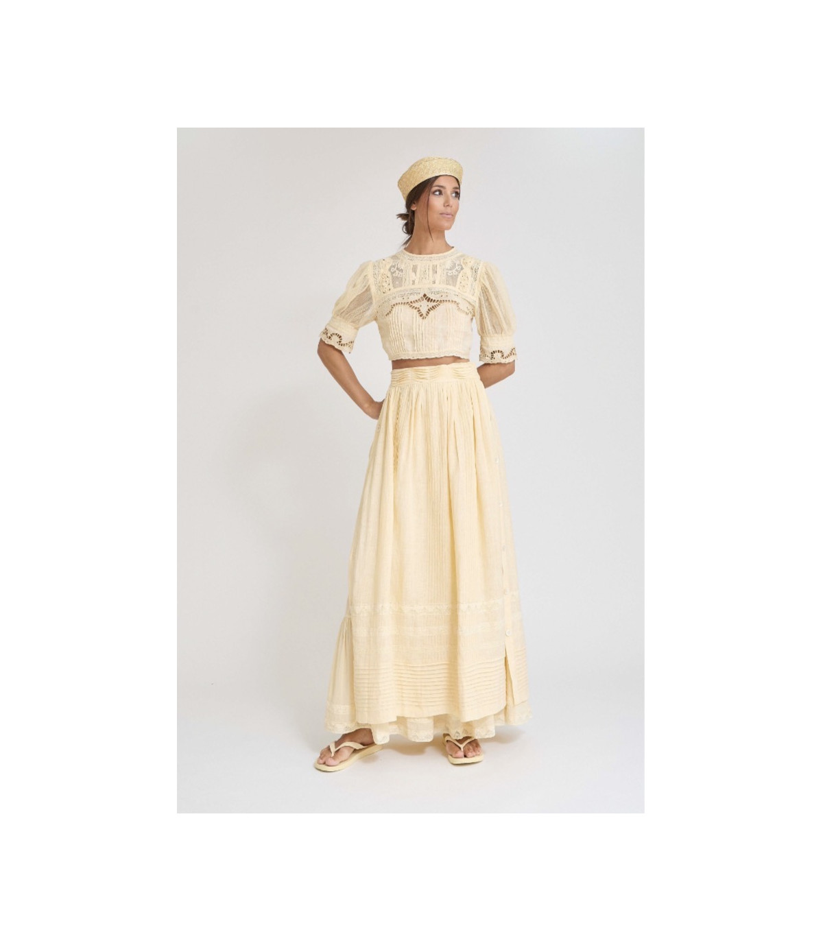 Confeccionado en mezcla de algodón y lino, este top corto en color vainilla destaca por su exquisito trabajo de puntilla y detalles calados, aportando un aire femenino y elegante. Su silueta estructurada con manga ligeramente abullonada estiliza la figura y añade un toque especial al conjunto.