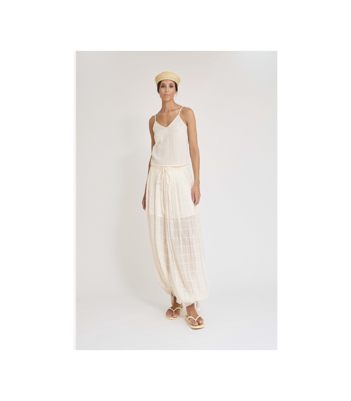 Confeccionado en 100% algodón natural, este pantalón en color crudo destaca por su silueta amplia y ligera, que aporta un efecto fluido y favorecedor. Su diseño incorpora puño en el tobillo con lazada ajustable, un detalle que estiliza la figura y añade un toque contemporáneo al look.