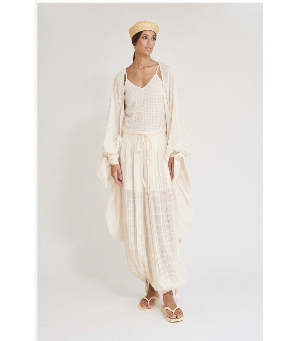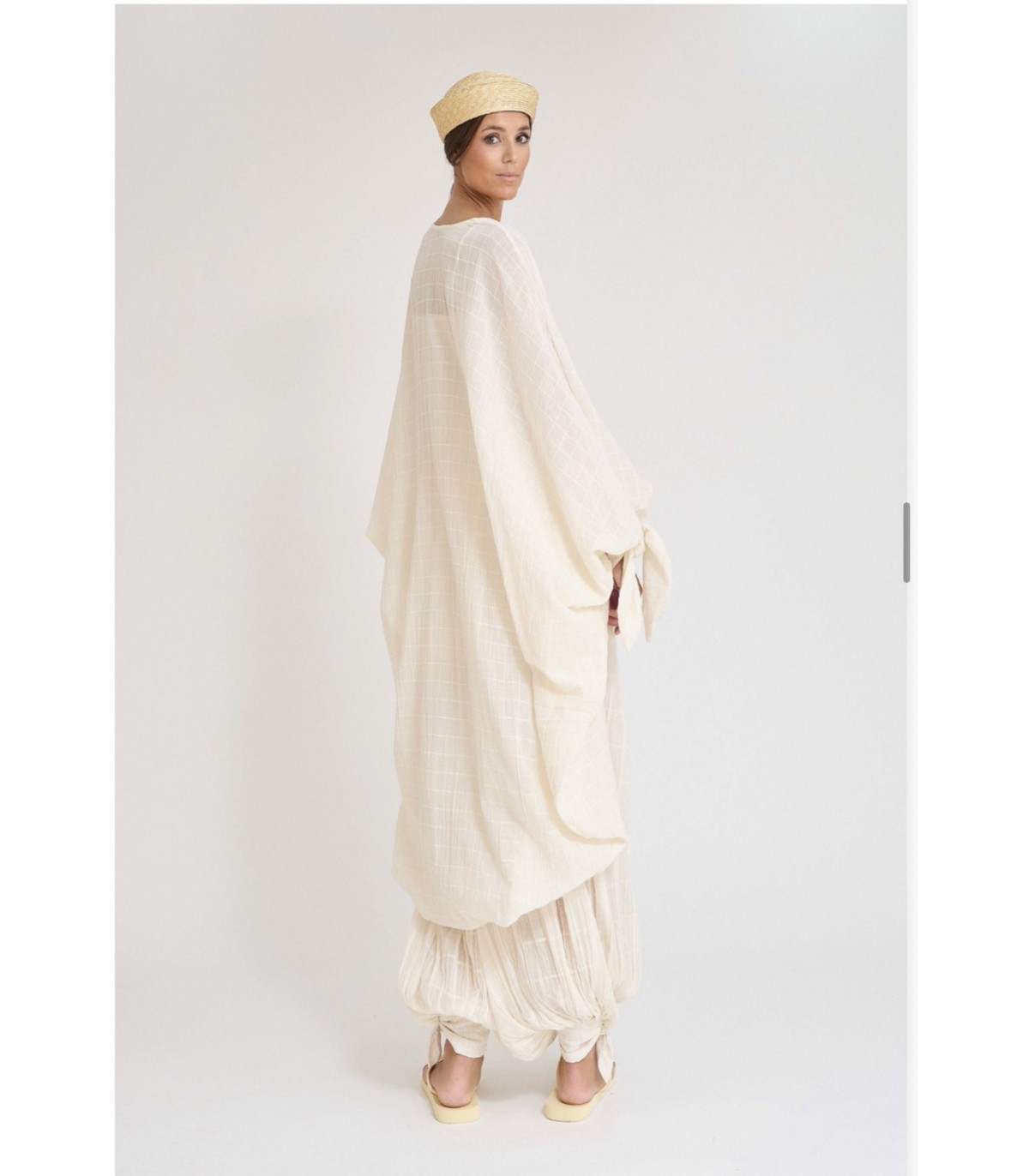 Confeccionado en 100% algodón, este kaftan combina dos tejidos que crean un sutil juego de texturas y transparencias, aportando ligereza y frescura. Su corte amplio y fluido envuelve la silueta con naturalidad, convirtiéndolo en una prenda cómoda y muy favorecedora.