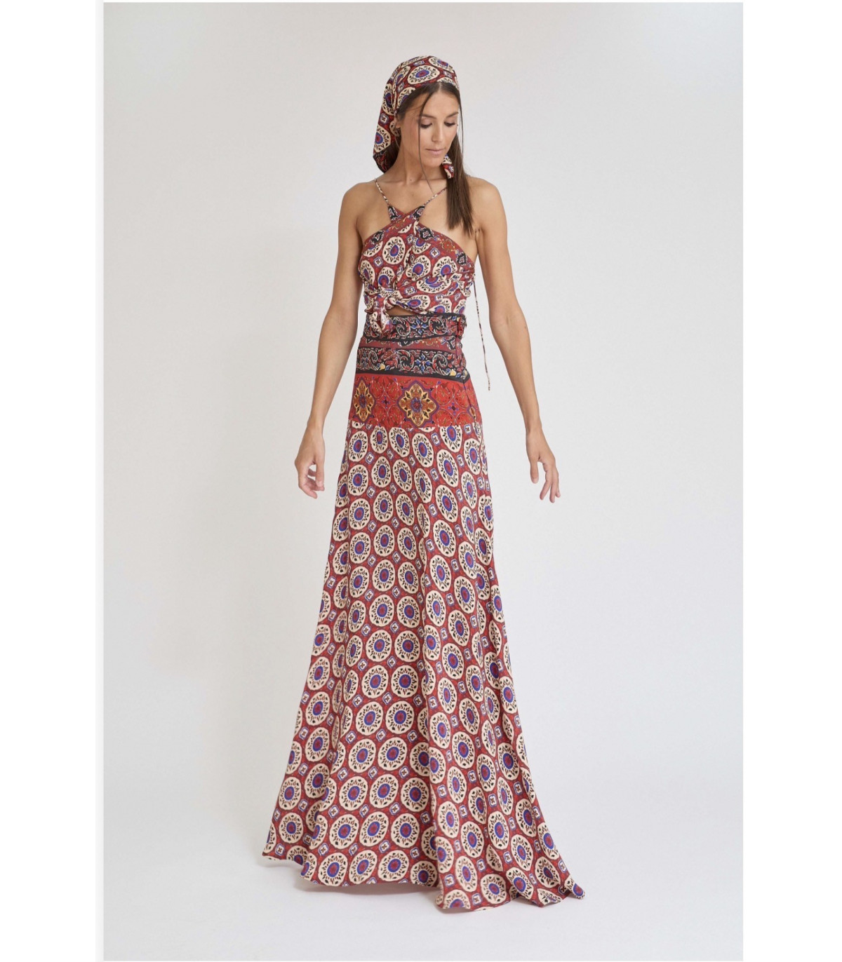 Confeccionada en tejido de viscosa ligera, esta falda destaca por su caída fluida y su silueta elegante. El diseño combina un estampado de colores con grecas decorativas, creando un efecto visual sofisticado de inspiración boho y mediterránea.
