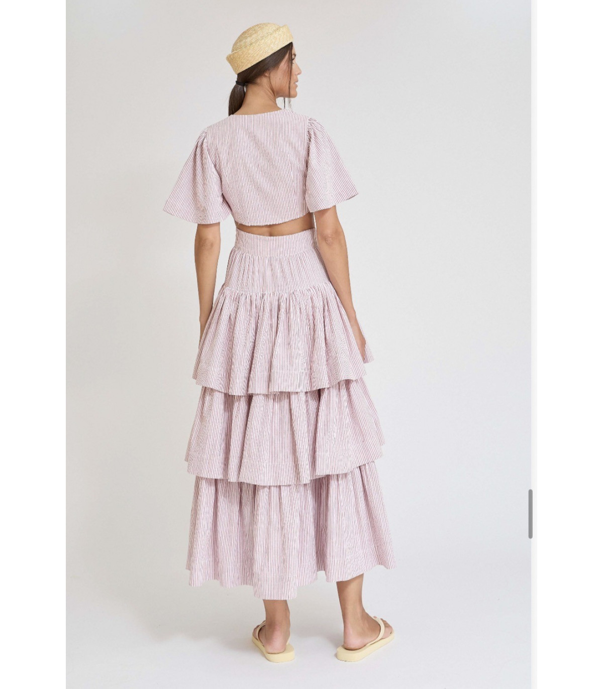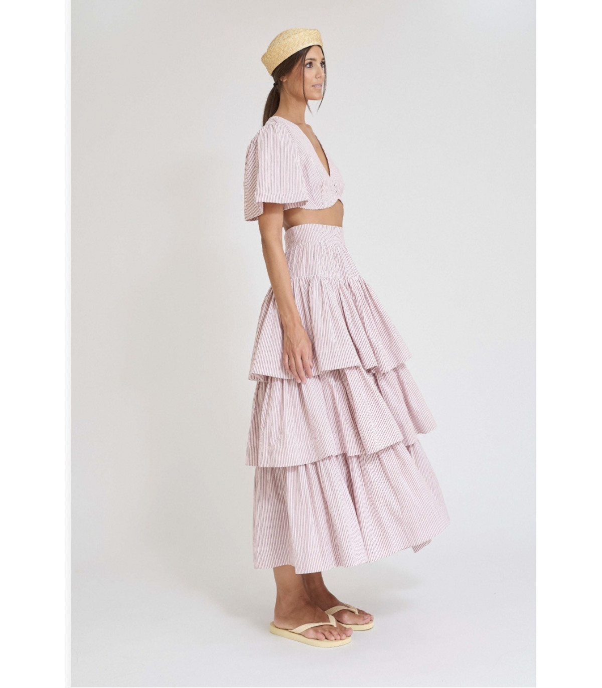 Compra la Falda Amboto de Zaitegui en FriendsnShop. Falda de volantes en algodón 100% con rayas rojas y blancas. Diseño femenino y exclusivo SS26.