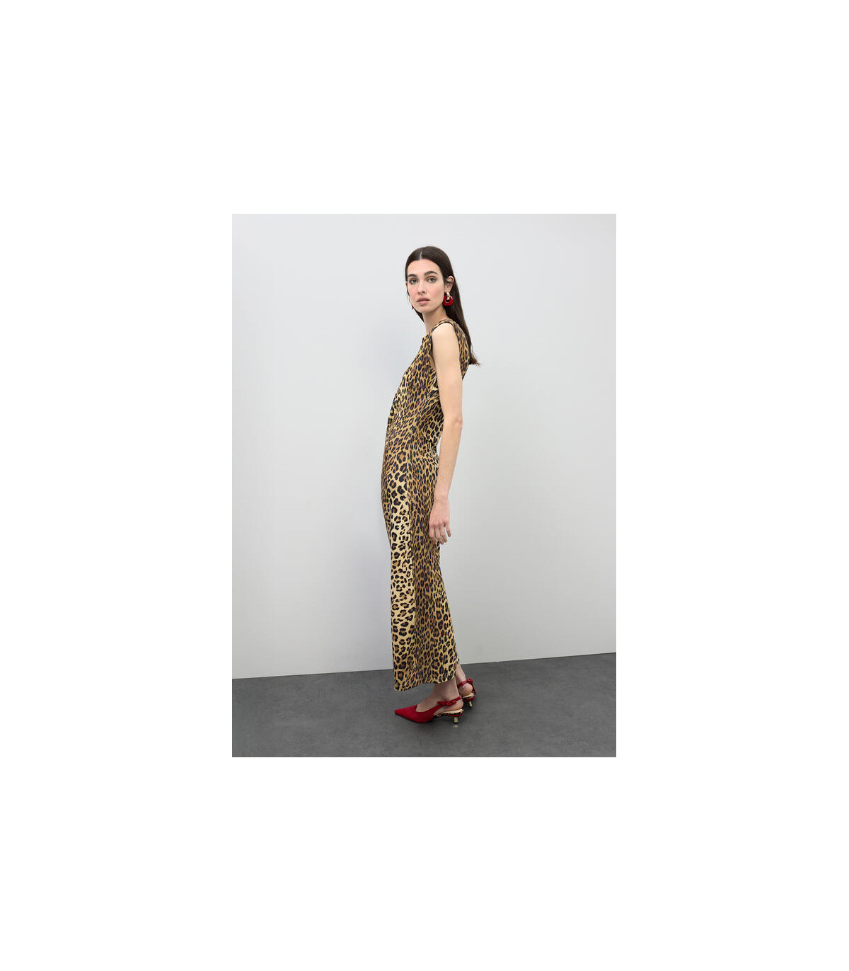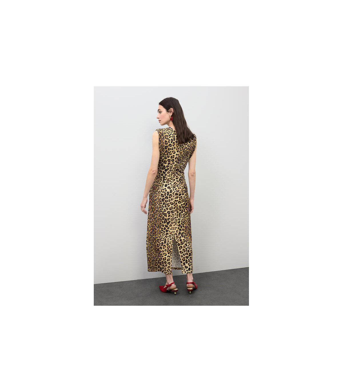 Confeccionado en tejido ligero, este vestido midi animal print para mujer destaca por su silueta ajustada y su drapeado lateral estratégico, que estiliza la figura y aporta movimiento. El clásico estampado leopardo en tonos marrón multicolor lo convierte en una prenda versátil y con carácter.