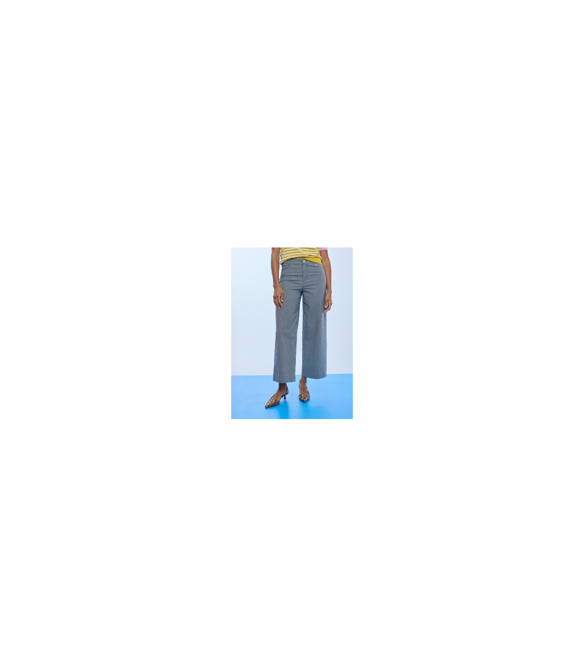 Confeccionado en tejido de sarga estructurado, este pantalón culotte para mujer presenta un corte ancho y largo midi que estiliza la silueta y aporta movimiento. El estampado de rayas añade dinamismo y un toque moderno, convirtiéndolo en una opción ideal para looks urbanos y elegantes.