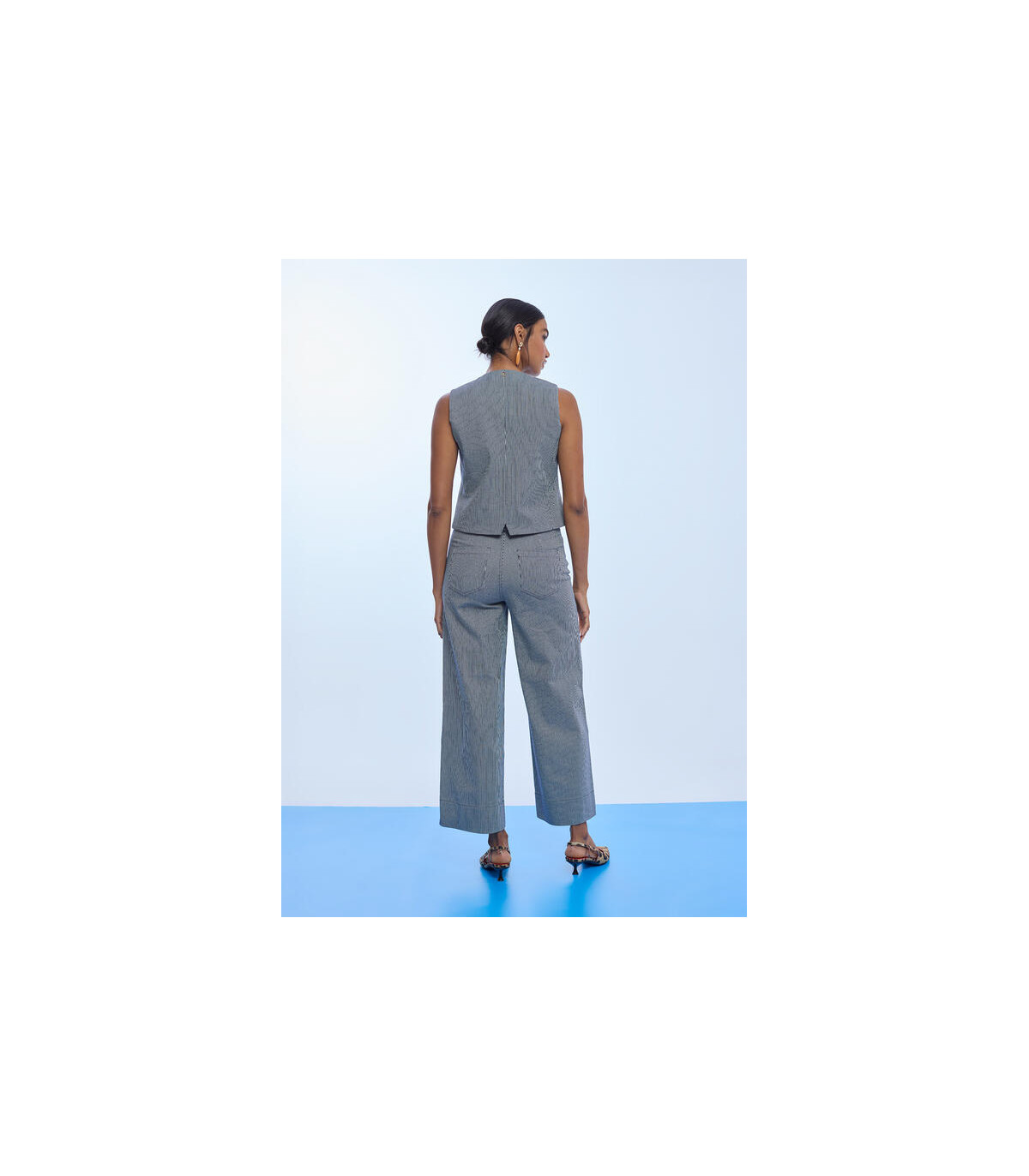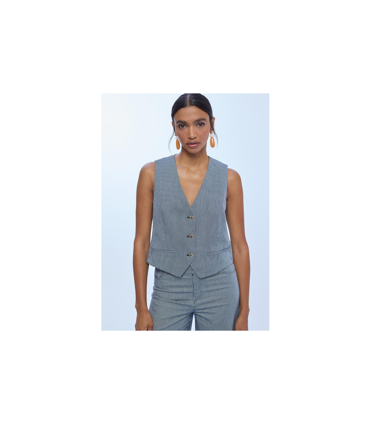 Confeccionado en tejido de sarga estructurada (98% algodón, 2% elastano), este chaleco femenino combina comodidad y ajuste favorecedor. Su diseño sin mangas con escote en pico y cierre frontal de botones estiliza la figura, mientras que el estampado de rayas verticales aporta un efecto visual que alarga la silueta.