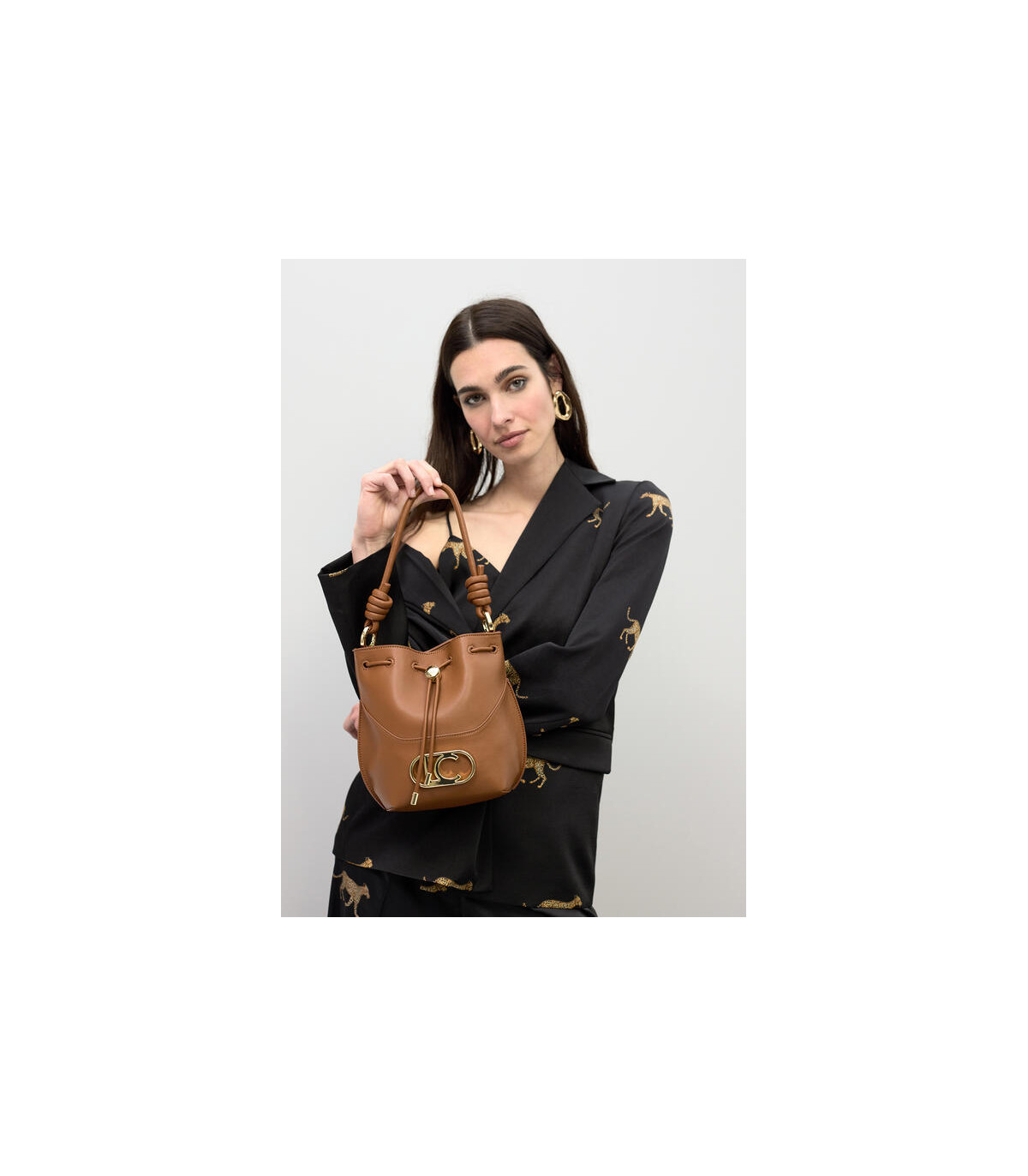 Diseñado en 100% poliuretano con forro interior 100% poliéster, este mini bolso combina estructura y ligereza. Su característica asa con nudos decorativos aporta personalidad y tendencia, mientras que el logo metálico frontal refuerza la identidad icónica de la marca.