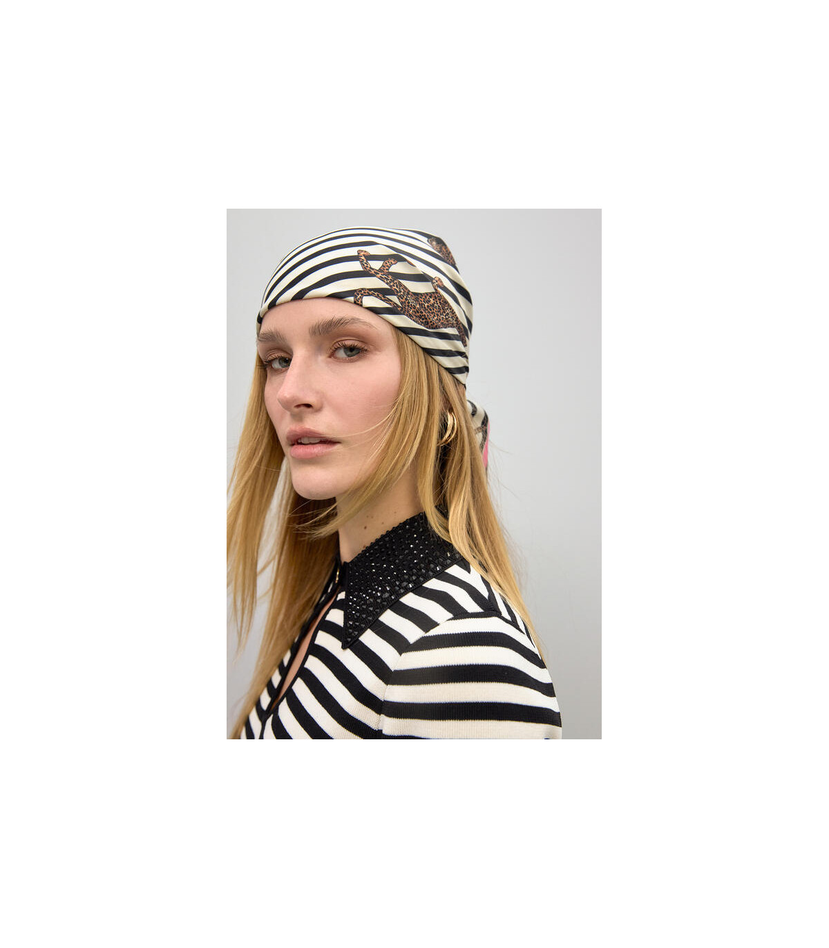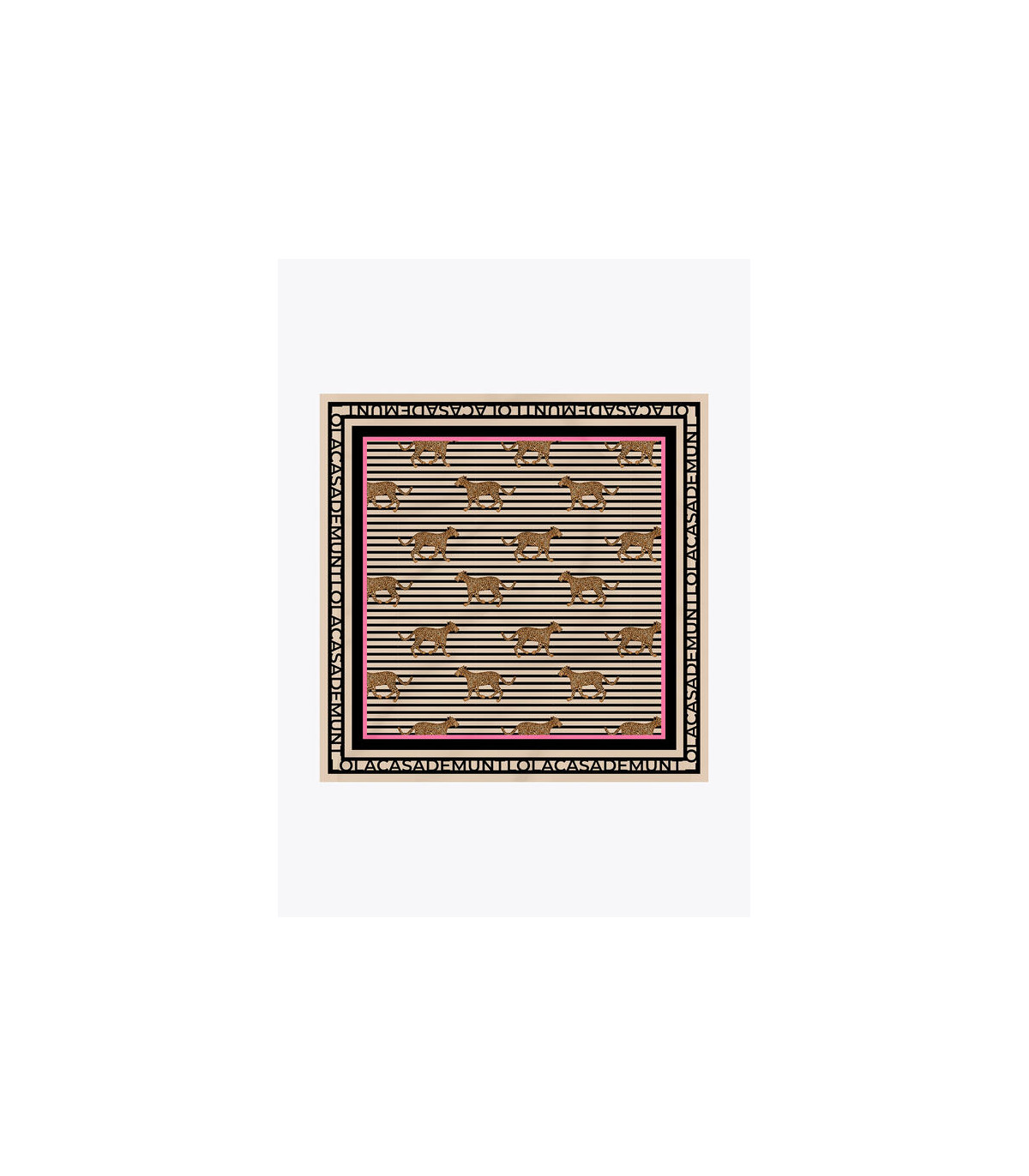 Su diseño en negro multicolor combina rayas horizontales con motivo animal print y detalles del logo en el marco, creando un pañuelo elegante, moderno y con identidad propia. Confeccionado en tejido satinado 100% poliéster, ofrece una textura suave y ligera con un acabado brillante que aporta luminosidad al estilismo.