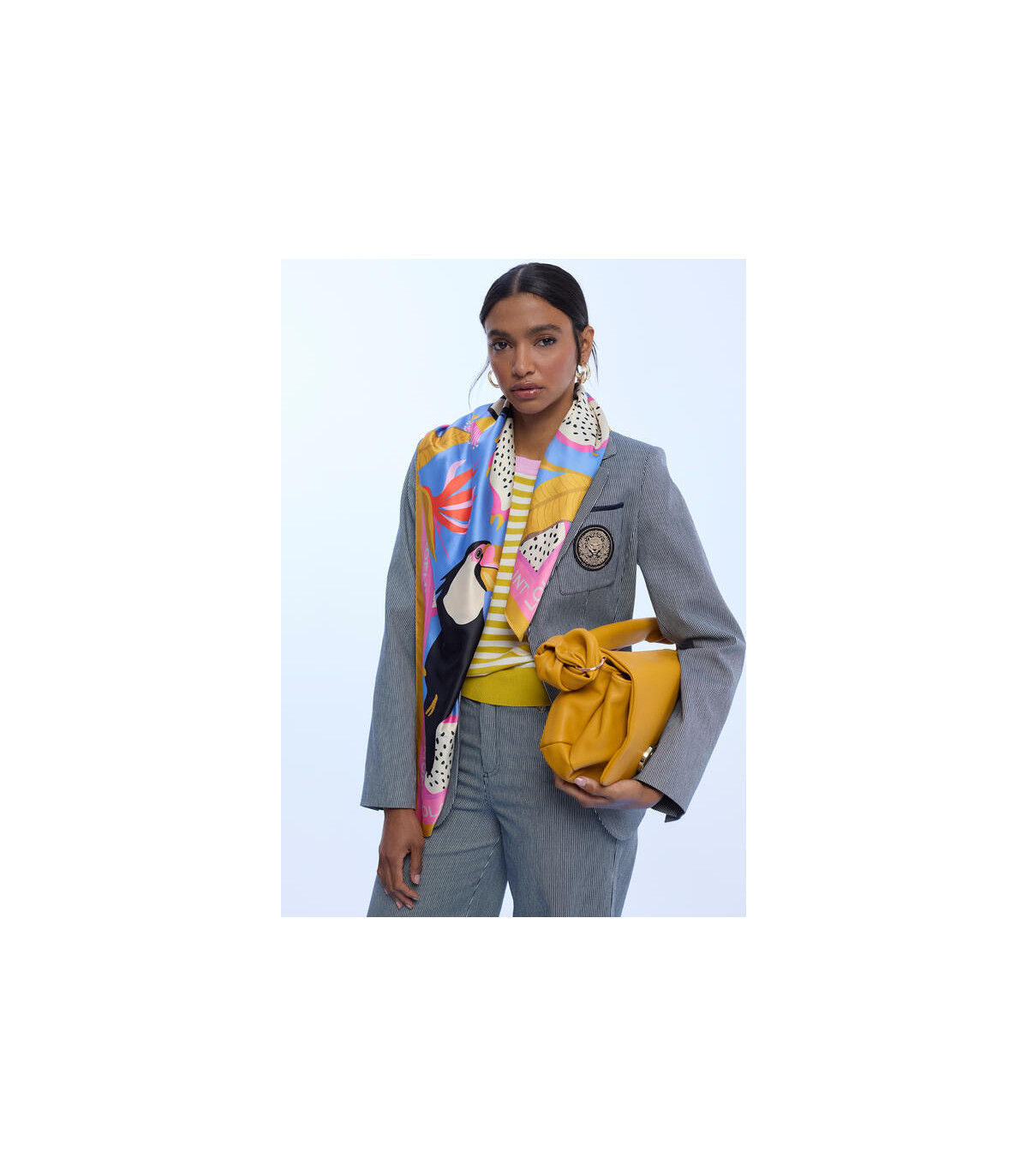 El pañuelo satinado con estampado tropical azul de Lola Casademunt es el complemento perfecto para aportar frescura, color y personalidad a tus looks.