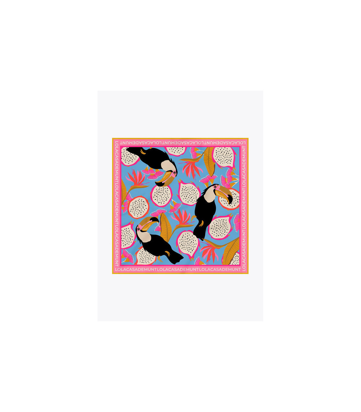 Su diseño en azul multicolor combina ilustraciones tropicales con aves exóticas y frutas sobre fondo vibrante, enmarcado con el logo de la marca. Un accesorio llamativo y alegre que transmite energía y estilo sofisticado.