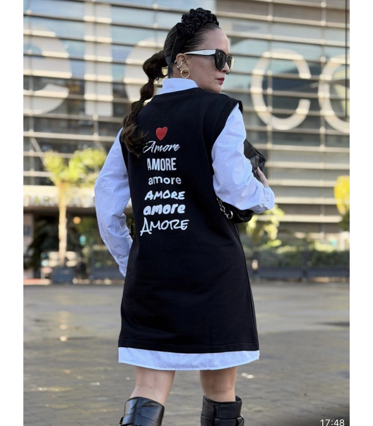 Este vestido efecto layering crea la ilusión de llevar dos prendas en una sola pieza: una camisa blanca clásica combinada con un vestido tipo sudadera negro. El contraste entre ambos tejidos aporta un look sofisticado y desenfadado al mismo tiempo.