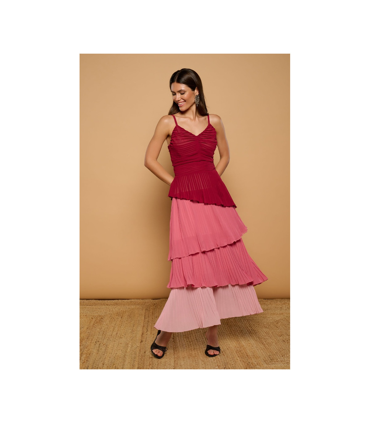 El vestido Fenicia de Minueto es una prenda sofisticada y femenina que destaca por su diseño elegante y su movimiento fluido. Su corte largo con volantes en capas aporta un aire romántico y delicado, ideal para ocasiones especiales o eventos donde quieras destacar.