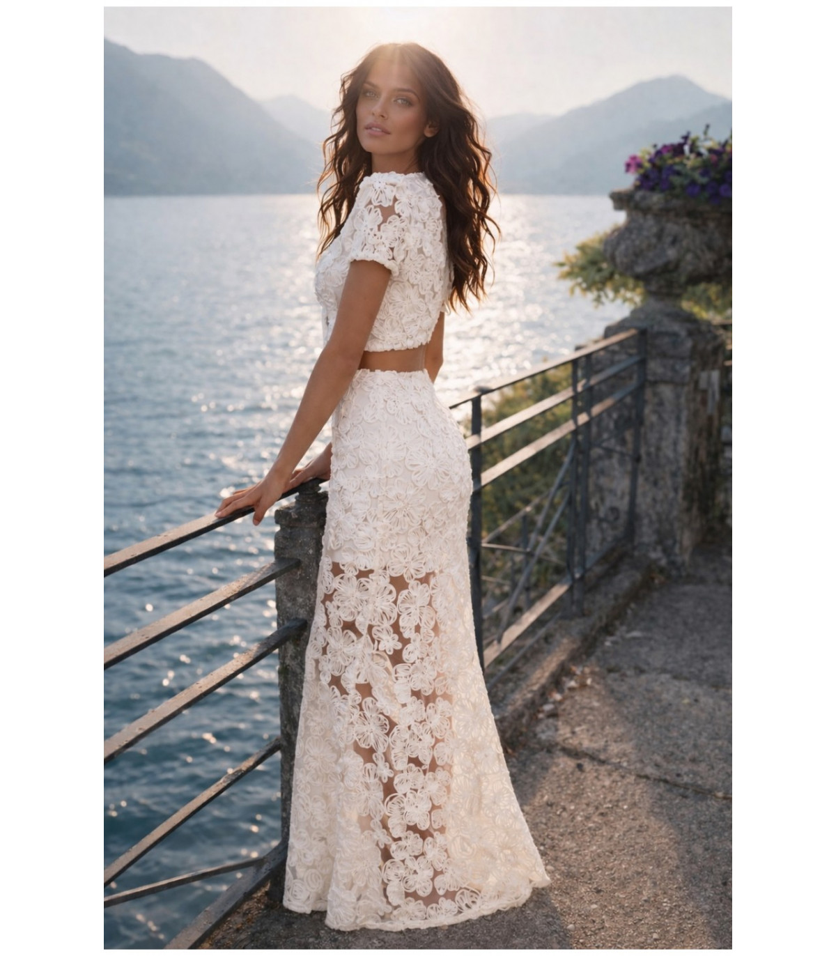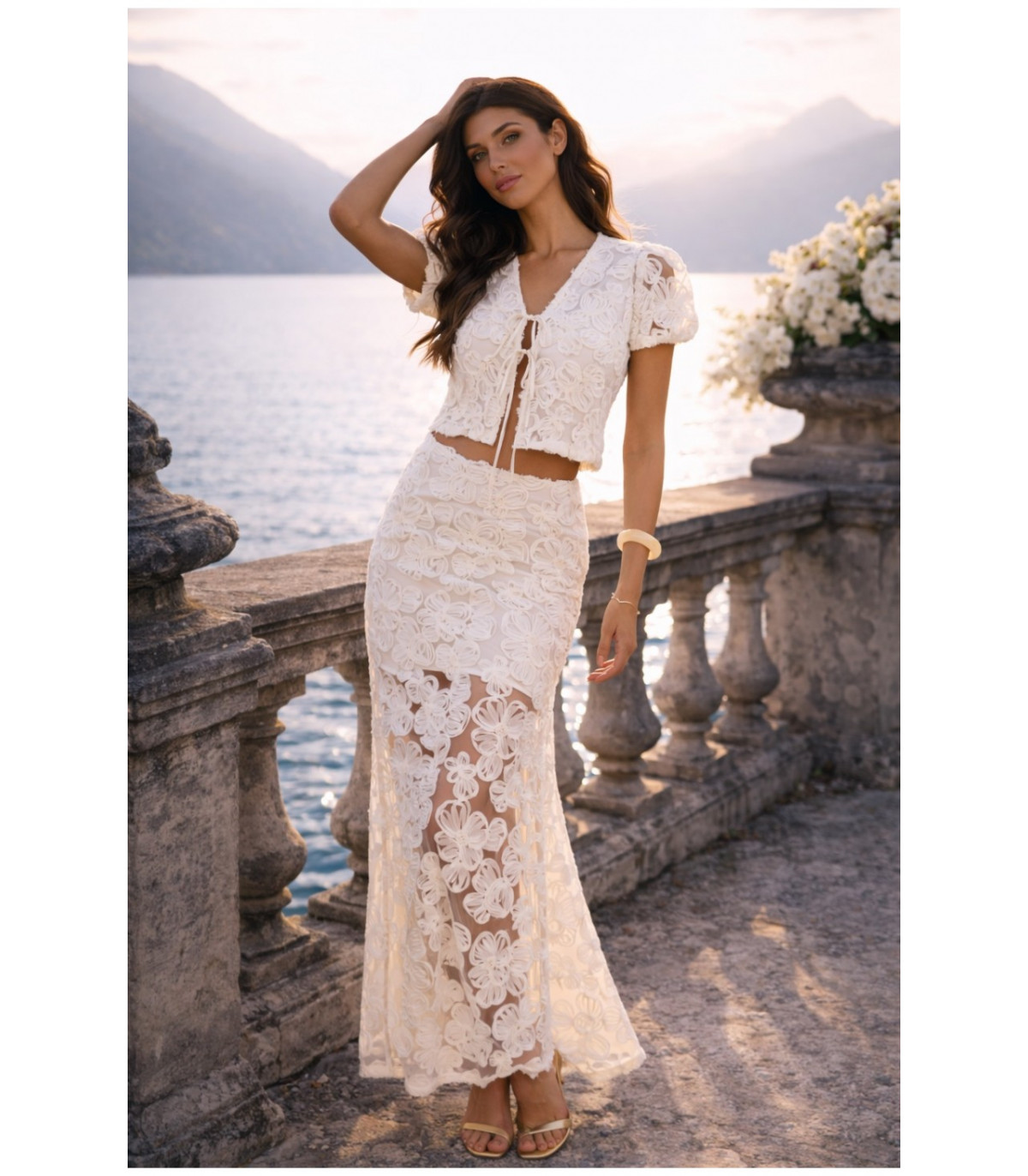 El top de manga corta con detalles florales en relieve y cierre frontal aporta un aire romántico y favorecedor, mientras que la falda larga semitransparente con bordados crea un efecto ligero y elegante que estiliza la silueta. Su diseño cuidado convierte este conjunto en una pieza única y muy especial.