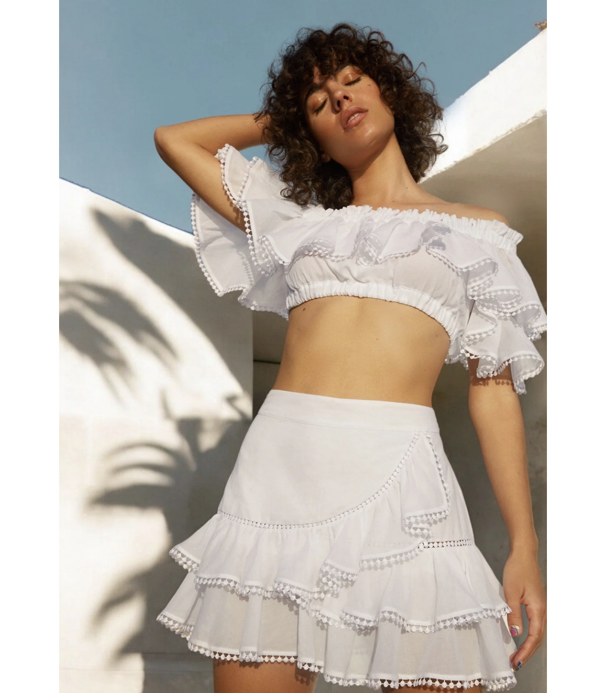 Su estructura de volantes en capas aporta movimiento y un aire romántico, mientras que los detalles sutiles y acabados cuidados reflejan la esencia artesanal de la firma. El color blanco la convierte en una pieza versátil, ideal para combinar con tops, blusas o conjuntos a juego.