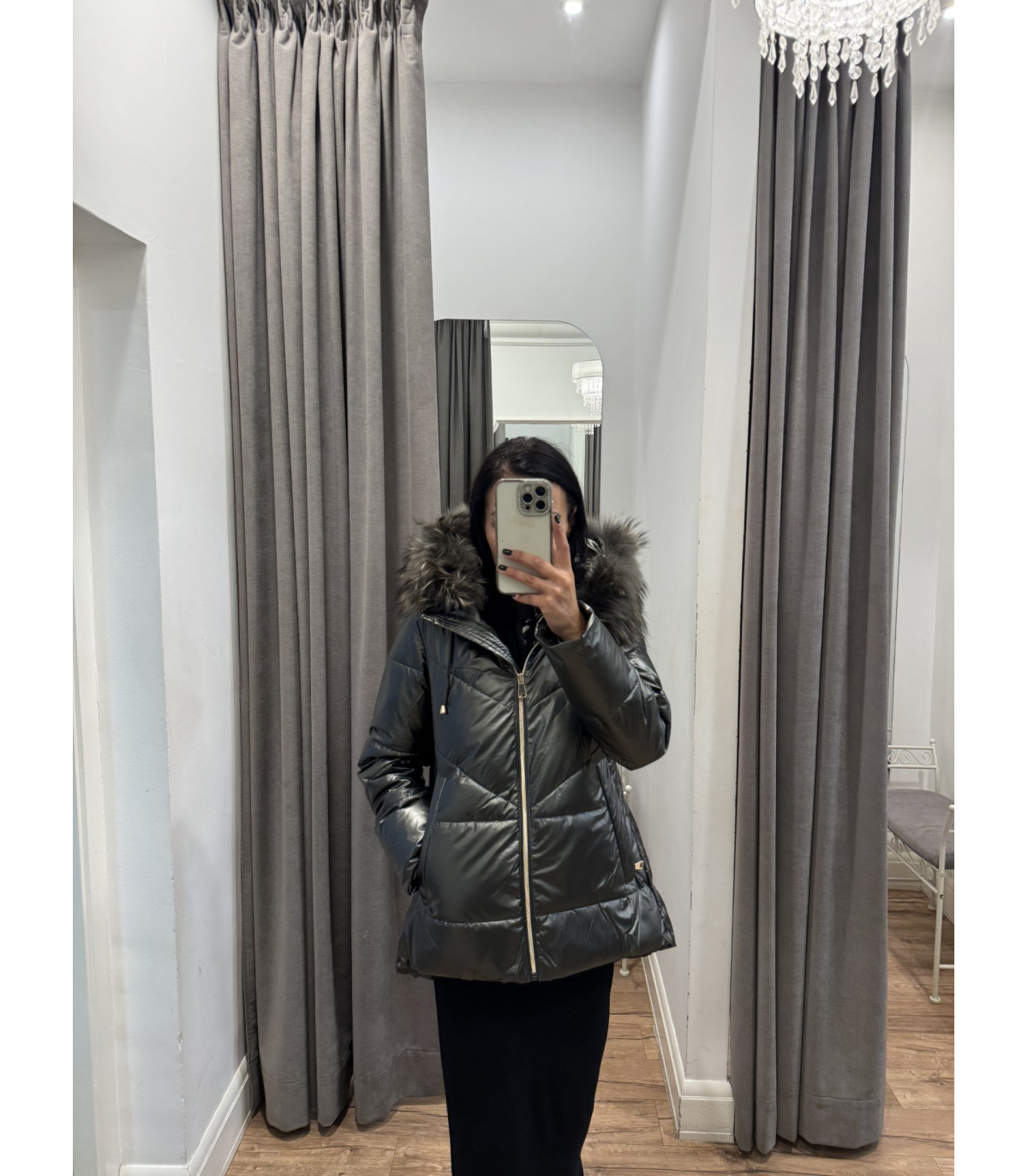 Cazadora gris con pelo natural, cálida y sofisticada. Diseño moderno y elegante para tus looks de invierno.
